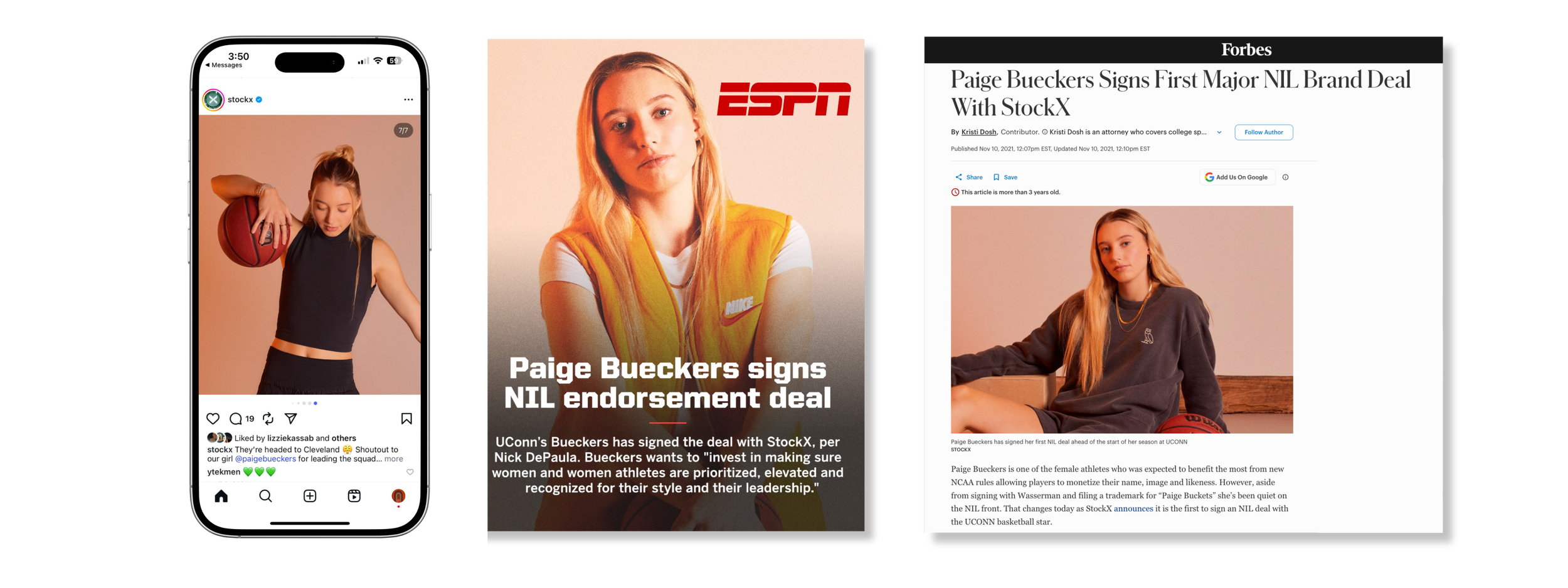 first-ever NIL partnership between a college athlete and a global brand. The campaign celebrated Paige’s influence both on and off the court, blending sport, culture, and fashion into one cohesive visual story. Upon launch, the project was met with major buzz and press coverage, positioning StockX at the forefront of athlete partnerships in the new NIL era.